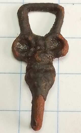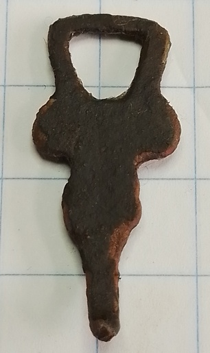 PAN-type 08-02-01-01-03 gegoten kledinghaak met één haak Groep C Datering 1500 tot 1649. Wordt ook wel een “uiltje” genoemd