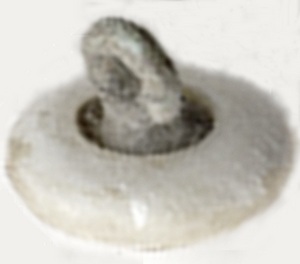 Ivoor of porseleinen sierknoop met zilveren inzet. Het oogje ontbreekt maar was van het type swagde-in dat werd gebruikt voor niet metalen knopen.