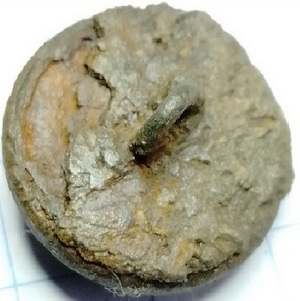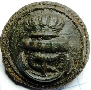 Knoop van de koninklijke marine met hierop gekroond anker met ankertouw. De binnenzijde is opgevuld met hout, een oude manier om een bolle knoop steviger te krijgen