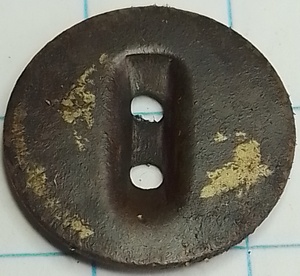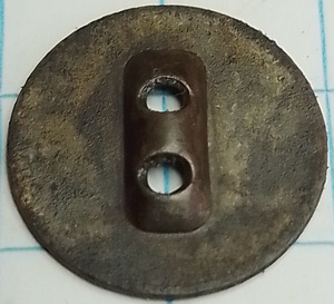 Knoop met een uitsparing in het midden waar twee gaatjes in zitten. Messing of geelkoper.