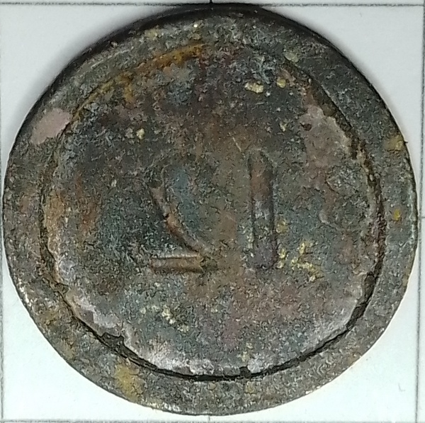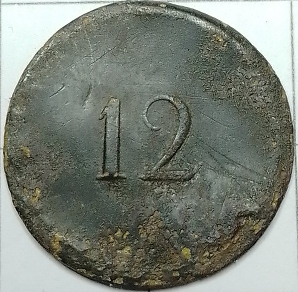 Knoop van het 12de linie regiment infanterie ten tijde van de Bataafse republiek (ca 1795-1806). De knoop is een model 1803 (gedragen 1805-1807). Dit is een knoop waarbij de kern van hout, bot of een ijzer plaatje is geweest waarover een kapje met nummer 12 is getrokken.