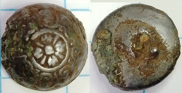 Wambuisknoop van nikkel met in het midden een cirkel waarin een vierbladige bloem staat. Erom heen staan krulletjes.