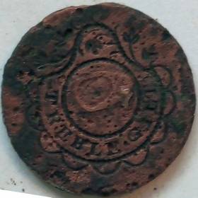 De achterzijde is echter mooi versierd. Te zien is een cirkel met hieromheen de tekst “treble gilt”. Hier omheen zit een soort hoefijzer die is versierd met kleine (klimop) blaadjes.