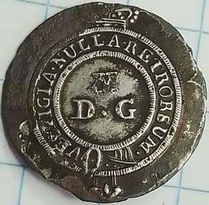 Vz: V boven D.G. binnen een gekroonde kousenband met het motto “VESTIGIA NULLA RETRORSUM”