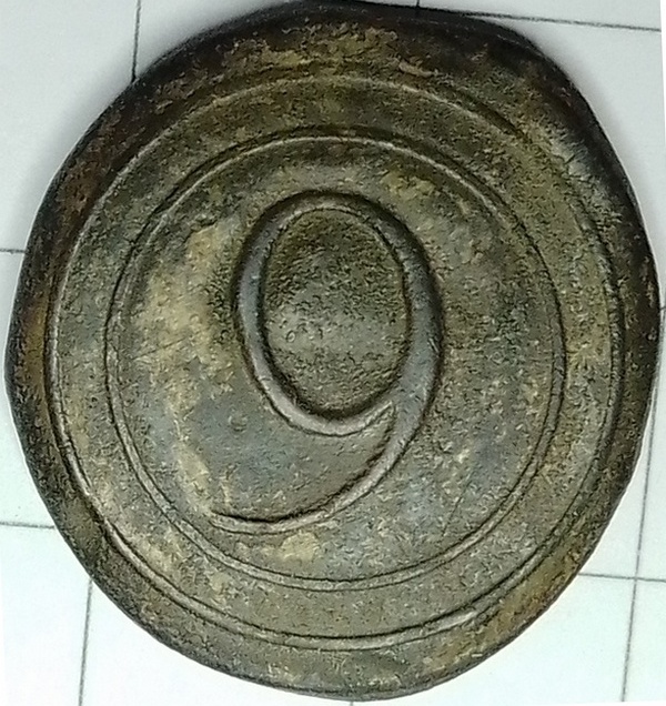 Knoop van het 9de linie regiment infanterie ten tijde van het Koninkrijk Holland(ca1806-1810). De knoop is van model 1806 (gedragen vanaf 1807) Dit is een knoop waarbij de kern van hout, bot of een ijzer plaatje is geweest waarover een kapje met nummer 9 is getrokken. Om de 9 staan twee cirkels. Het verschil overigens tussen een cijfer 9 en een cijfer 6 is dat de 9 een langere staart heeft.