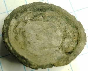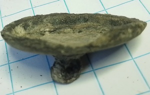 Dit is een massieve tweedelig gegoten knoop gemaakt van tin of zink. De kop is afwijkend. Deze is omgekeerd hol convex. Hiermee komt deze in terecht in PAN groep 09 MASSIEVE KOP, RELATIEF KORTE STAAFVORMIGE STIFT, LAATMIDDELEEUWS, 08-01-02-05 (ca1400-1500)