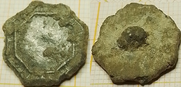 Platte achthoekige knoop, versierd. Deze lijkt sprekend op andere loodtinnen exemplaren. Deze knoop is echter erg licht en waarschijnlijk van aluminium. Ook de corrosie duidt op aluminium. Destijds was dit metaal erg zeldzaam en deze knoop zal dan ook kostbaar geweest zijn. Op de achterzijde een meegegoten oog.