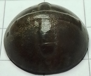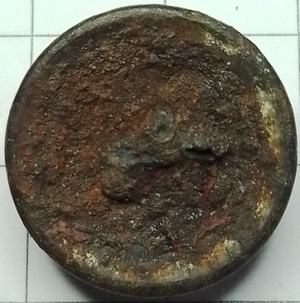 Halfbolle knoop van de Artillerie met gekruiste kanonnen. De achterkant is verroest. Hier heeft dus duidelijk een ijzeren achterkant (plaatje) opgezeten. Dit werd gedaan bij oude modellen artillerie knopen.