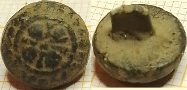 Knoop met staafoog en kop met hierop een cirkel waarin een bloem in een kruis staat