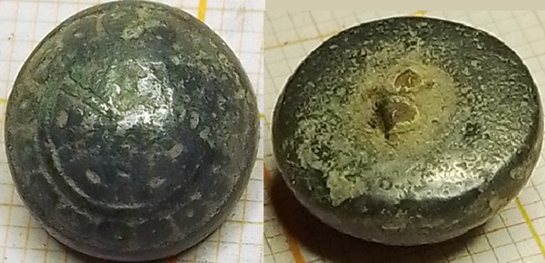 Wambuisknoop van nikkel met in het midden een cirkel waarin een vierbladige bloem staat. Erom heen staan krulletjes.
