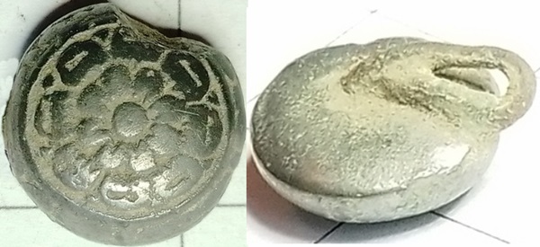 Knoop met hierop een bloem met schutsbladen. Opvallend bij dit knoopje is dat deze gemaakt is van tin/nikkel en geen draadoog heeft maar een lusoog.