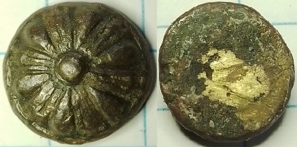 knoop met hierop een bloem waarbij de blaadjes worden afgewisseld met spaken. Er is geen zichtbaar bevestigingspunt van een oogje en dat is voor zowel een staaf als gietdraadoog erg vreemd.