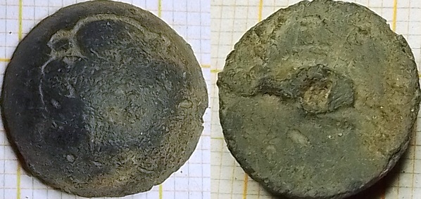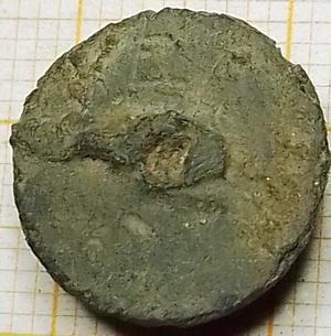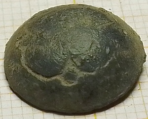 Knoop 4-blad bloem met (ontbrekend) oog. Op de achterkant staan letters gekrast. Het lijkt op VEE of KEE