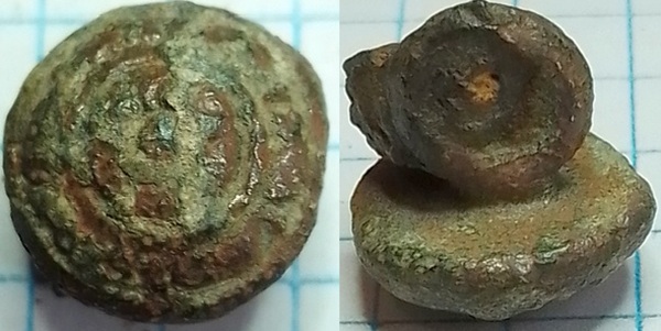 Knoop met een bloemetje in een cirkeltje in een fleuron. In het oogje zitten ijzerresten dus het heeft waarschijnlijk een ijzeren bevestiging gehad
