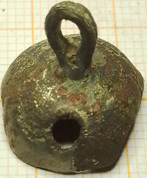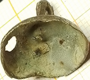 Onderkant van een bolle holle knoop met ontluchtingsgat. De knoop lijkt zilver of i.i.g. verzilverd.