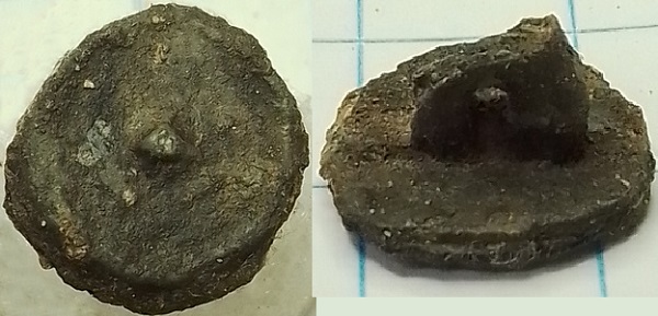 Knoop van een grijze metaallegering (waarschijnlijk tin). Er staat een cirkel op met in het midden een punt
