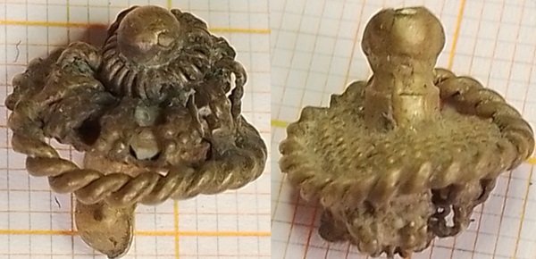 Filigrain knoopje of sieraad. Het lijkt een beetje op een Zeeuws knoopje. Aan de onderzijde zit een soort bevestiging die waarschijnlijk ergens in geklikt heeft gezeten.