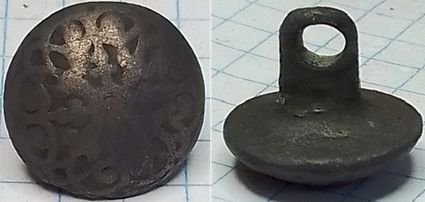 Knoop met staafoog en kop met hierop een leliekruis. Opvallend bij de tekening van dit kruis is dat er dikkere lijnen zijn gebruikt. Ook het metaal lijkt meer glimmend. Wellicht is dit dus een 18de eeuwse kopie van een 17de eeuws model.