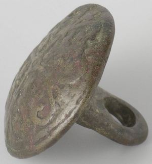 Knoop staafoog (afgebroken) van een gegoten koperlegering. Voorzijde: fleuron