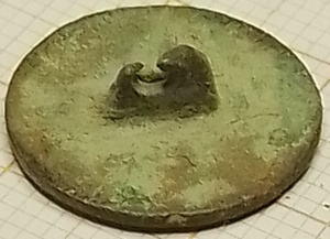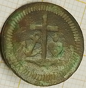 Platte knoop met hierop een kruis (geloof), een anker (hoop) en een hart (liefde). Wellicht een knoopje van een geestelijke (binnen het leger) of van een bisschoppelijk leger.