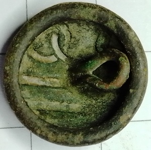 Eenvoudig gestanste knoop. Ik ga er voorlopig vanuit dat het een knoop is van het genootschap van de Odd Fellows. Hun logo bestaat uit drie cirkels met elkaar verbonden die staan voor “vriendschap”, “liefde” en “waarheid”. Dit in ca 1730 opgerichte genootschap uit Engeland heeft ook een tak in o.a. Nederland.