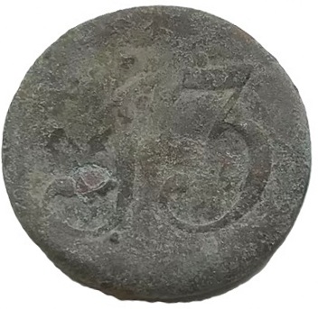 Zilvergrijze platte knoop. Determinatie door Rob Wolters op de FB-groep Dutch Military Buttons 1795-1815: “Deze vorm van de 1 is typerend voor Nederlandse emblemen. Deze knoop behoorde toe tot een militair van de 13e Afdeling Nationale Infanterie, of van het Bataljon Infanterie van Linie nr 13.”