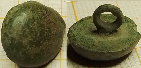 Dit kwartbolle knoopje valt op door zijn grote afmeting van 16mm en strakke afwerking met zeer platte onderkant. Dit is daarom ook hoogst waarschijnlijk een knoopje uit begin 18de eeuw.
