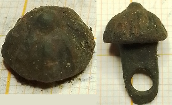 knoop met staafoog. Brons. Kegel geribd met punt, ook wel eens tietknoop genoemd.