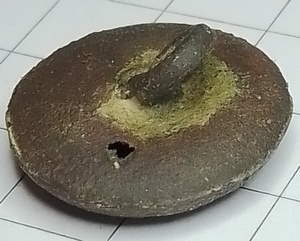 Kwartbolle holle knoop met ontluchtingsgat. Op de achterkant een gesoldeerd oog
