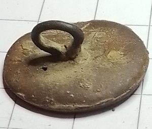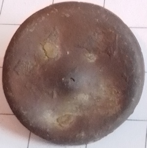 Kwartbolle verzilverde holle knoop met ontluchtingsgat. Op de achterkant een gesoldeerd oog
