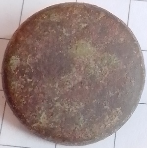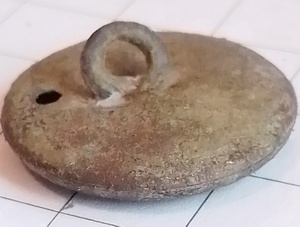 Kwartbolle holle knoop met ontluchtingsgat. Op de achterkant een gesoldeerd oog