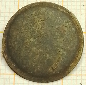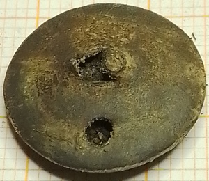 Kwartbolle holle knoop met ontluchtingsgat. Op de achterkant een gat waar of een los oogje heeft ingezeten of er op gesoldeerd is geweest