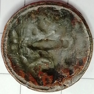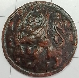 Messing knoop met leeuw (leeuw type B). De knoop is enkelvoudig, het oog is rechtstreeks op de holle voorkant gesoldeerd. Door de holte is de afbeelding in spiegelbeeld deels in de binnenzijde zichtbaar. De leeuw kenmerkt zich door het neerwaartse uiteinde van de staartpunt en de dubbele lus links van de pijpenbundel. Dit type knoop is op de model 1912 veldjassen gebruikt, en kan tot de vroegste productie van de knoop met leeuw gerekend worden. Het blijft tot na WO1 in gebruik, wordt gedurende die periode wel meer vervangend door knopen met een tweede laag als achterkant waarin het oog is vastgezet