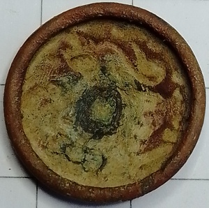 Messing knoop met leeuw (leeuw type B). De knoop is enkelvoudig, het oog is rechtstreeks op de holle voorkant gesoldeerd. Door de holte is de afbeelding in spiegelbeeld deels in de binnenzijde zichtbaar. De leeuw kenmerkt zich door het neerwaartse uiteinde van de staartpunt en de dubbele lus links van de pijpenbundel. Dit type knoop is op de model 1912 veldjassen gebruikt, en kan tot de vroegste productie van de knoop met leeuw gerekend worden. Het blijft tot na WO1 in gebruik, wordt gedurende die periode wel meer vervangend door knopen met een tweede laag als achterkant waarin het oog is vastgezet