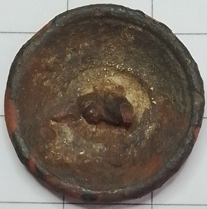 Messing knoop met leeuw (leeuw type B). De knoop is enkelvoudig, het oog is rechtstreeks op de holle voorkant gesoldeerd. Door de holte is de afbeelding in spiegelbeeld deels in de binnenzijde zichtbaar. De leeuw kenmerkt zich door het neerwaartse uiteinde van de staartpunt en de dubbele lus links van de pijpenbundel. Dit type knoop is op de model 1912 veldjassen gebruikt, en kan tot de vroegste productie van de knoop met leeuw gerekend worden. Het blijft tot na WO1 in gebruik, wordt gedurende die periode wel meer vervangend door knopen met een tweede laag als achterkant waarin het oog is vastgezet