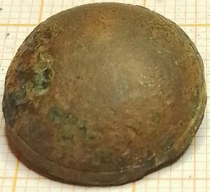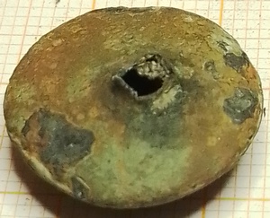 Op de achterkant een gat waar of een los oogje heeft ingezeten of er op gesoldeerd is geweest. Opvallend is het kleine randje aan de voorzijde. Het lijkt hierdoor alsof de knoop is geperst. De soldeernaad zit echter op de rand. Wellicht heeft men een gestanste knoop proberen te imiteren.
