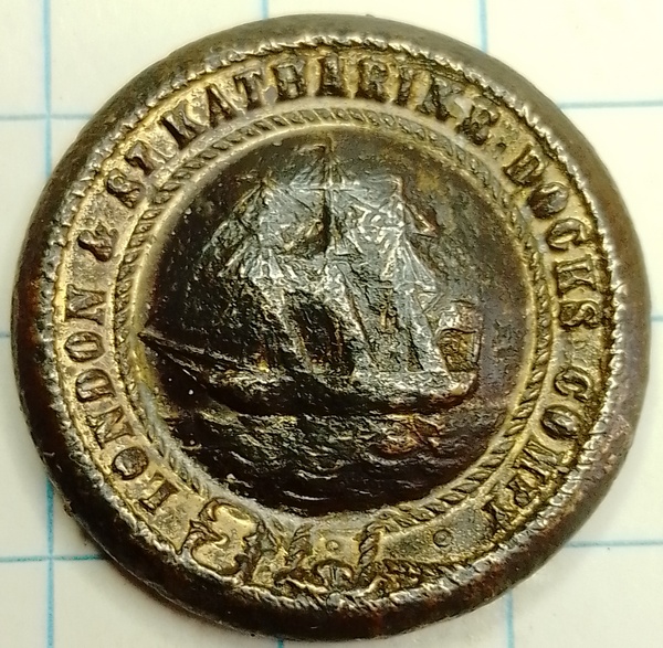 vz: driemaster (schip) met hierom de tekst “london & St katharine docks compy”