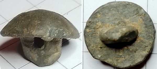 Heeft veel gelijkenis met de tinnen knoop in Kennemerland in metaalvondsten pag 211 nr 22.5.83