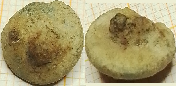 lood-tinnen knoop met gietnaad waarbij het ijzeren draadoog iets te ver in de kop is gestoken waardoor er een bobbel is ontstaan