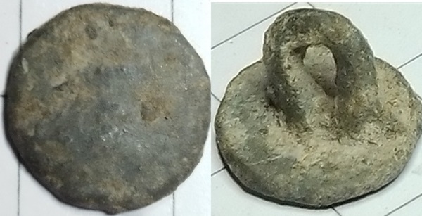 Plat rond knoopje van loddtinlegering van ca 15mm. Op de achterkant zit een dik lusvormig oogje