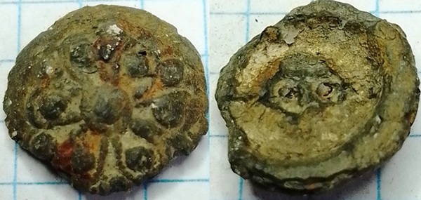 Deze loodtinnen knoop heeft een bloemmotief die vaak werd gebruikt in de middeleeuwen. Op de dikke convexe achterkant ontbreekt een draadoogje.