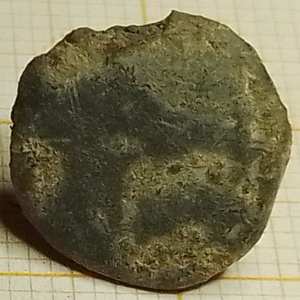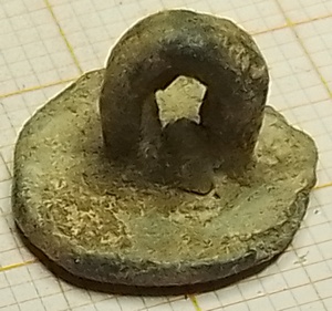 Plat rond knoopje van loodtinlegering van ca 13mm. Op de achterkant zit een dik lusvormig oogje