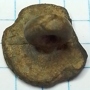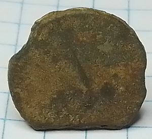 Plat rond knoopje van loodtinlegering van ca 18mm. Op de achterkant zit een dikke lus op een stift