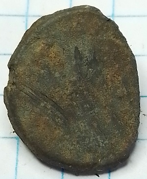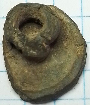 Plat rond knoopje van loddtinlegering van ca 18mm. Op de achterkant zit een dik lusvormig oogje