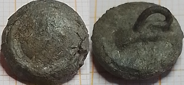 Deze platte lood-tinnen knoop met rand heeft een draadoog. De voet van het oogje lijkt als een omega verankerd te liggen