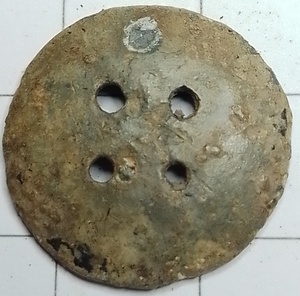 Knoop met 4 gaten van waarschijnlijk zink. Deze lijkt ooit zwart geverfd te zijn. Tijdens WWI werden Belgische knopen zwart geverfd omdat deze anders teveel opvielen.