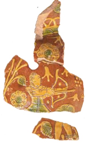 Klein knoopje (zonder oogje) van 11mm met hierop een afbeelding van wellicht een boogschutter. Ook op slibaardewerk uit begin 17de eeuw kwamen boogschutters voor. Zie voorbeeld uit De hand van de decorateur – Hollands slibaardewerk 1550-1670, een publicatie van |Huis van Hilde.