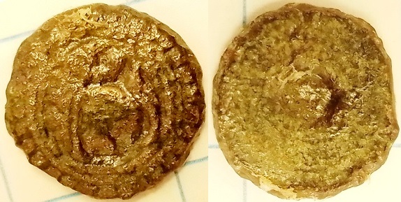 Klein knoopje (zonder oogje) van 11mm met hierop een afbeelding van wellicht een boogschutter. Ook op slibaardewerk uit begin 17de eeuw kwamen boogschutters voor. Zie voorbeeld uit De hand van de decorateur – Hollands slibaardewerk 1550-1670, een publicatie van |Huis van Hilde.