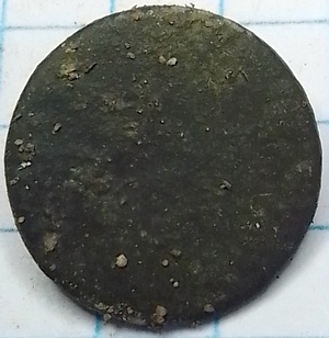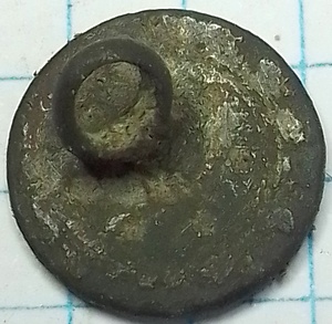 Eenvoudige platte knoop 14mm. De knoop is verzilverd geweest. Dit is nog op de achterzijde zichtbaar.