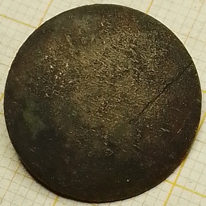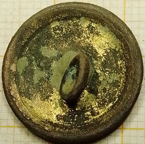 Platte knoop waarbij het het kopje over de achterzijde is geperst met een bolle rand zodat de knoop steviger werd of mooier op de kleding lag. De knoop is verguld geweest.